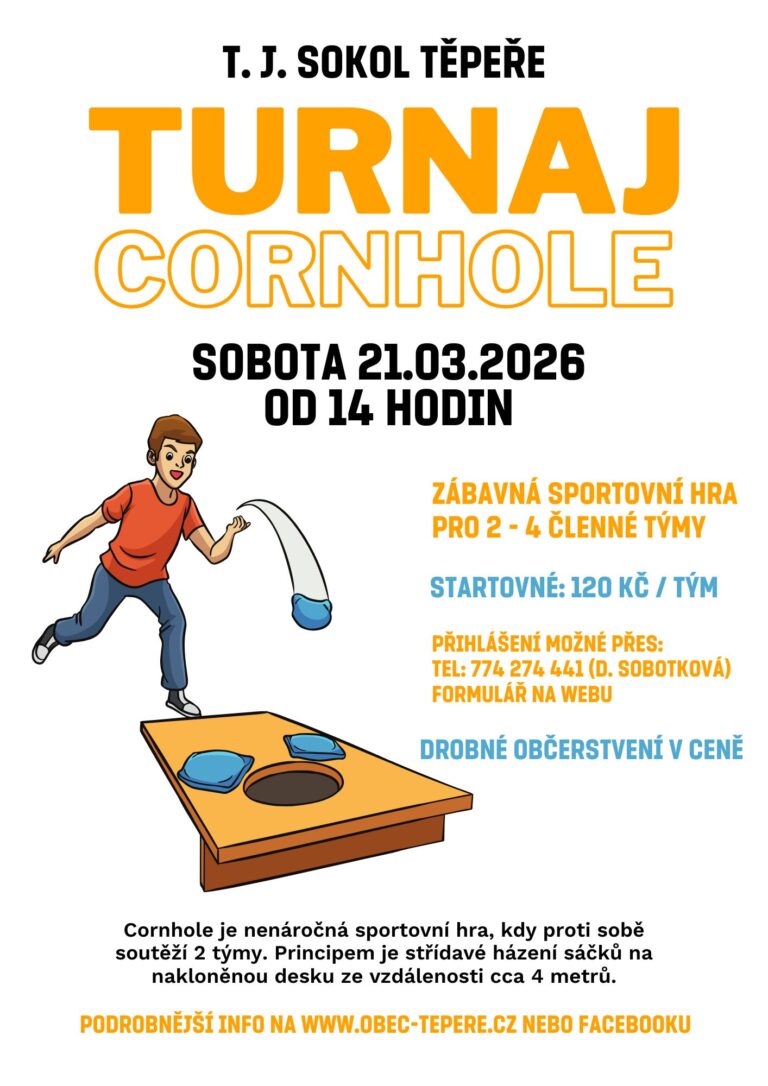 T. J. Sokol Těpeře pro Vás pořádá turnaj týmů v CORNHOLE